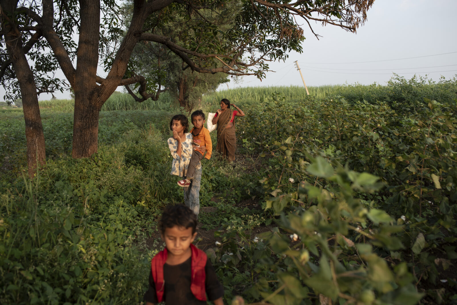 Ms. Chaure walking home in Kawadgaon with her three children in October. In the sugar season after her operation, she stayed behind and worked the family smallholding. (Saumya Khandelwal for The New York Times)